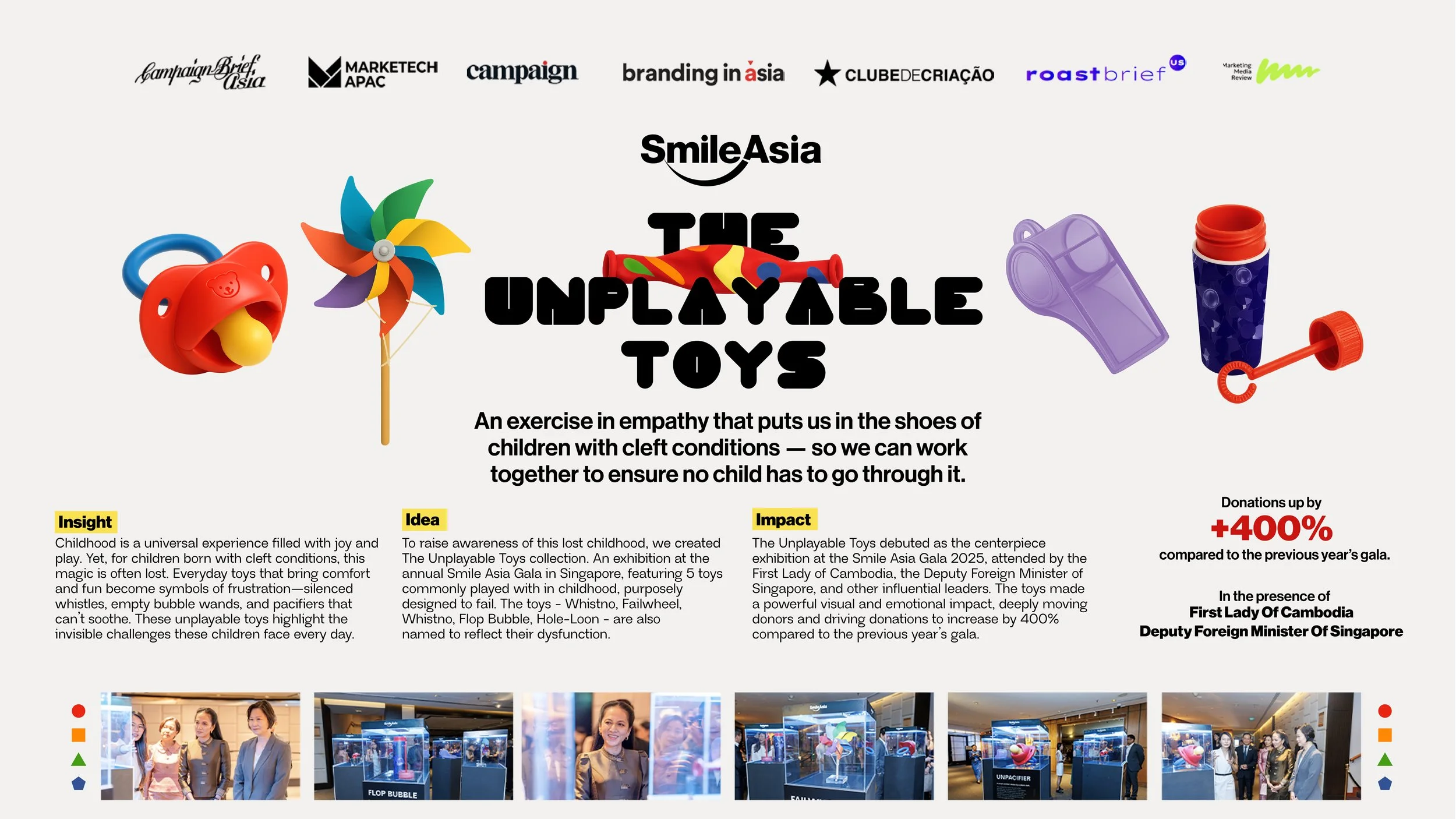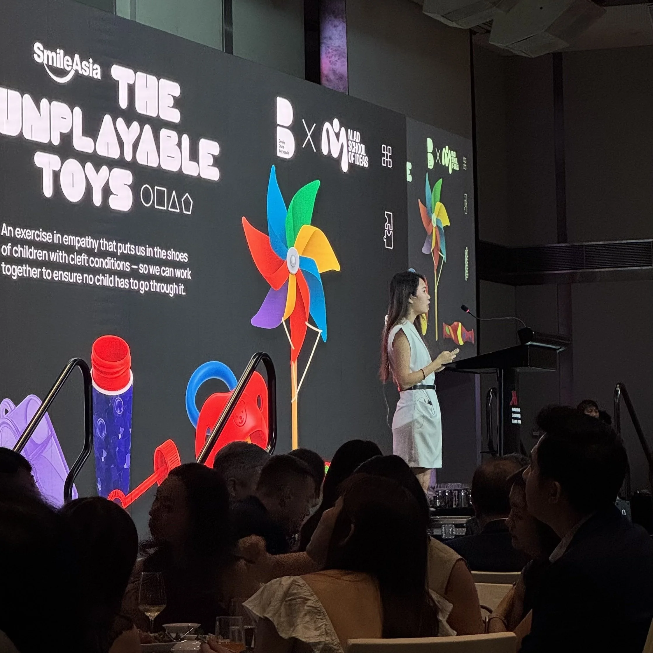 Presenting Unplayable Toys at the Smile Asia Charity Gala 2025 on behalf of DDB Group Hong Kong and Miami Ad School, to advocates like Pich Chanmony, amplified the campaign’s mission to drive empathy and change for children with cleft conditions.